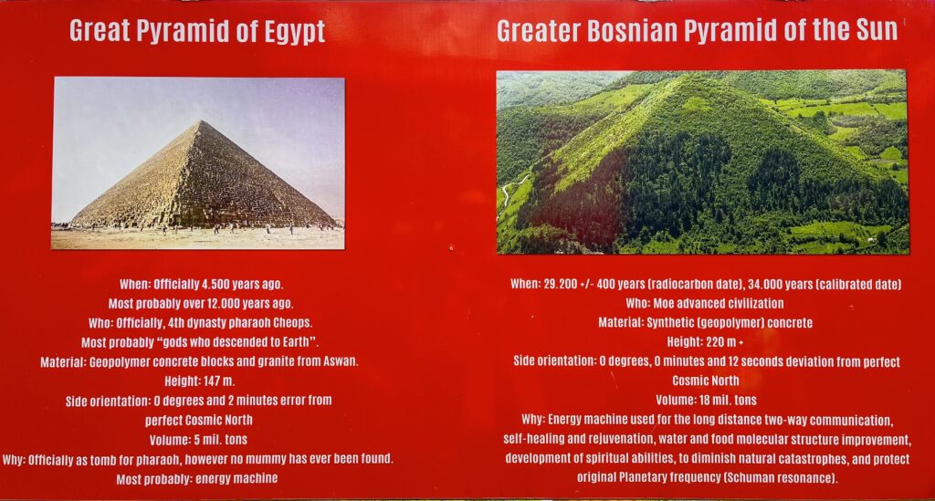 Vždy prahnem po informáciách a aj tentoraz som sa chcela dozvedieť viac o tvrdeniach hlavného archeológa a objaviteľa Dr. Semira Osmanagića, ktorý je od roku 2005 na misii, ktorú si sám financuje. Čo teda vieme naozaj, je, že Bosnianske údolie pyramíd je celosvetovým fenoménom a najväčším aktívnym archeologickým projektom na svete. Skladá sa z pyramíd Slnka (pôvodne 220 m), Mesiaca (190 m), Draka (90 m) a Chrámu Matky Zeme a Pyramídy Lásky. Vrcholy pyramídy Slnka, Mesiaca a Draka tvoria rovnostranný trojuholník (2.170 m). Všetky pyramídy sú orientované ku kozmickému severu. Ich objaviteľ vo svojej knihe z roku 2005 predpovedal na základe podobných prípadov v Egypte, Číne, Mexiku existenciu podzemného labyrintu, ktorý dnes poznáme pod názvom Tunely Ravne.